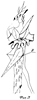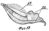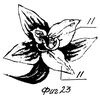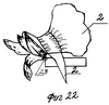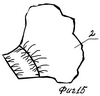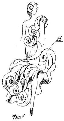 Изображенная на фиг.21 деталь с размещенными в ней эластично гибкими нитями 22, благодаря их стягиванию и расположению в различных направлениях, может принимать самые разнообразные пространственные формы, что позволяет использовать ее как в качестве деталей одежды, так и для предметов быта и при формировании игрушек (например, причудливой формы носа, ушей, лап, хвостов).