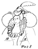 Костюм, представленный на фиг.7, сформирован из соединенных между собой произвольных фигур кроя 6, образующих пышные рукава, а шляпка и украшающий ее цветок выполнены из деталей 13, соединенных между собой.