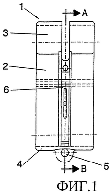 Из фиг.1 можно видеть, что показанная коробка 1 усовершенствованного держателя для ключей выполнена в виде удлиненного полого корпуса, центральная часть 2 которого образована двумя плоскими и параллельными стенками, соединенными наверху полукруглой частью 3 и внизу изогнутой частью 4, имеющей форму перевернутой полукруглой арки. На одной из стенок выполнена прорезь 6, которая продольно разделяет эту стенку на две одинаковые части, проходит через полукруглую часть 3 и оканчивается на другой стенке.