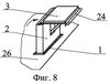 Складной столик также имеет два упора рабочего положения подкоса 6. Один из них находится на опорной секции 2 и выполнен в виде центрального выреза 18 в верхней части стенки опорной секции 2. На фиг.1 условно показан центральный вырез 18 на снятой стенке опорной секции 2. Другой упор 19 рабочего положения подкоса 6 выполнен в направляющих 7 столешницы 3 и может являться, например, концом прорези направляющих 7 (см. фиг.3).