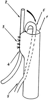 Производят удаление мочевого пузыря. Выполняется гетеротопическая везикопластика из тонкой или толстой кишки. На стенку дистального конца кишки (1) укладывают силиконовую трубку (2), оставляя не менее пяти сантиметров от края трубки до торцевого отверстия в кишке. Накладывают одиночные серо-серозные швы (3) на протяжении пяти сантиметров над трубкой, формируя над ней серозный канал (4). Накладывают одиночный шов (5), прошивая край серозного канала, шов затягивают. Лигатурами шва прошивают стенку кишки, проводя лигатуры из просвета кишки наружу на десять сантиметров ниже края торцевого отверстия. Натягивая лигатуры, инвагинируют серозный канал с дренажом в просвет кишки. Лигатуры связывают, фиксируя край инвагината к стенке кишки. В последующем уриностому оформляют на передней брюшной стенке, фиксируя по окружности к брюшине и к коже.