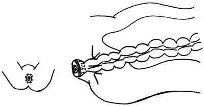 Несколько дней спустя перегородка, состоящая из задней стенки прямой кишки и передней стенки толстой кишки, передавливается крепкими и длинными зажимами Кохера, так что конвергирующие концы инструментов контактируют друг с другом в верхней части перегородки. После того как раздавленный треугольный участок стенки кишки некротизируется, зажимы Кохера отпадают и образуется единая полость ампулы прямой кишки (И.Литтманн – “Брюшная хирургия” – издание третье – Будапешт – 1970 – с.385).