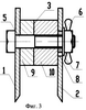 Подвижное (по оси долота) закрепление долота в направляющей конструктивно может быть реализовано множеством вариантов. В простейшем случае можно использовать втулку 7, толщина которой равна толщине долота 2 (фиг.3). В этом случае гайка 6 при затяжке упирается во втулку 7 и прижимает долото 1 к направляющей 3. При этом долото 2 благодаря расточке 8 отверстия под болт 5 с втулкой 7 может смещаться относительно направляющей 3 по оси долота.