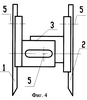 Для обеспечения широкого диапазона расстояний между долотами целесообразно иметь набор направляющих различных размеров и различной конструкции: с промежуточным обушком (фиг.1), без промежуточного обушка (фиг.3), разборные (фиг.3, 4 и 5). Причем разборные направляющие могут быть реализованы как в виде набора двух 9 и 10 (фиг.3) или большего числа вставок, так и в виде двух (фиг.4) или трех (фиг.5) элементов, имеющих возможность относительного смещения и последующей фиксации их относительно друг друга.