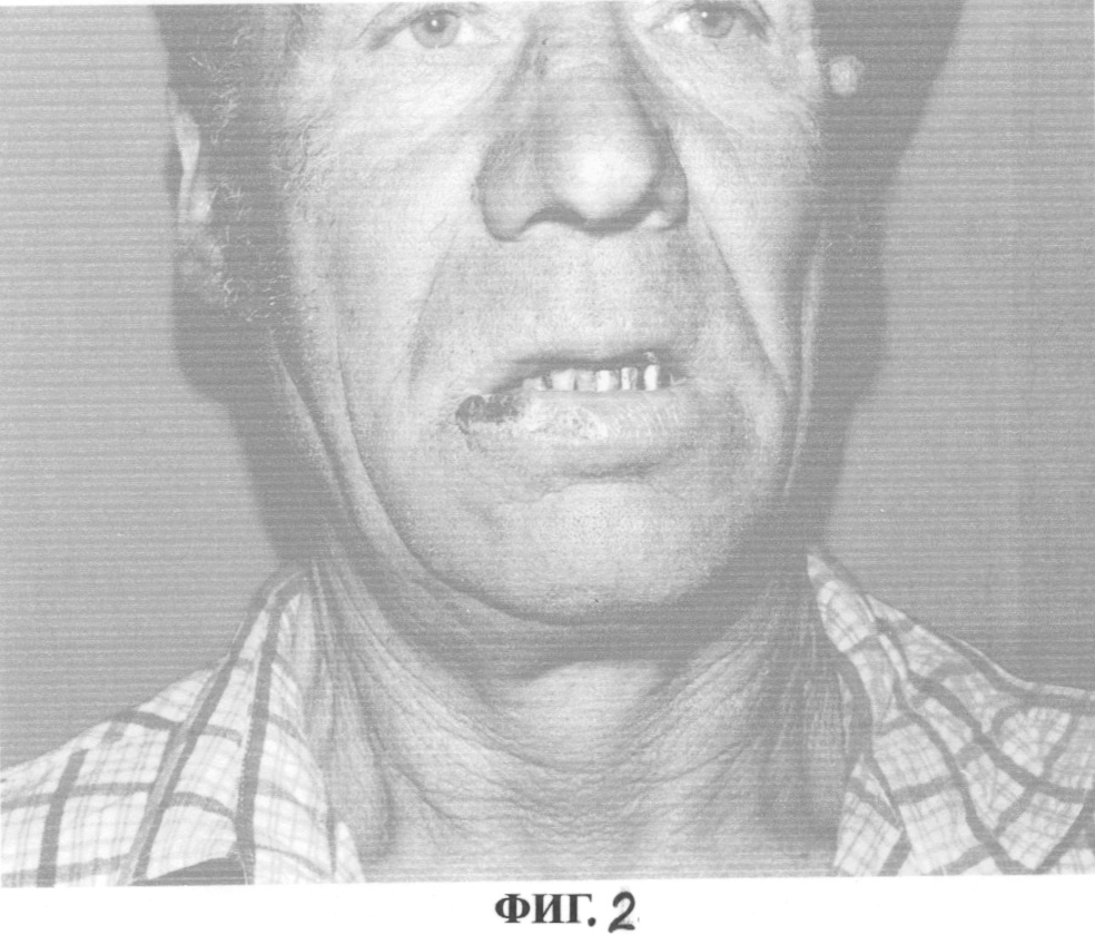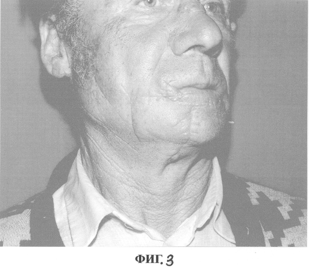 Под эндотрахеальным наркозом произведена трапециевидная резекция правой половины нижней губы, угла рта с формированием кожно-мышечных, слизисто-мышечных лоскутов со щек, иссечением треугольного лоскута в области подбородка и одномоментным закрытием послеоперационного дефекта с сохранением высоты преддверия полости рта нижней челюсти. Последующим формированием углов рта, восстановлением непрерывности круговой мышцы рта и слизистой красной каймы нижней губы (сохранением анатомо-функциональных особенностей губы и достаточно хороших косметических результатов). Послеоперационное течение без особенностей и осложнений. Через 8 дней сняты швы с кожи щек, нижней губы, а через 10 дней со слизистой оболочки губы и щек. Пациент выписан в удовлетворительном состоянии на дальнейшее диспансерное наблюдение (фиг.3). Через 3 недели проведена стандартная операция по удалению верхних шейных регионарных лимфоузлов и клетчатки.