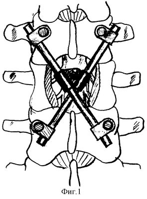 Изобретение относится к медицине, а именно к травматологии и ортопедии при фиксации поврежденного позвоночного сегмента в грудном, поясничном и крестцовом отделах позвоночника. Сущность заявляемого способа заключается в использовании в качестве опорных элементов транспедикулярной системы штанг, которые перекрещивают во фронтальной плоскости и соединяют между собой узлом крепления, узел крепления позволяет регулировать угол перекрещивания штанг в зависимости от возникающих требований, причем опорные элементы проводят через ножки дуг позвонков, что повышает надежность фиксации при достижении костного анкилоза. 2 ил.