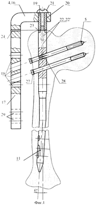 После снятия направителя 4 для предотвращения вывинчивания блокирующего винта 5 в резьбовое отверстие 22 штифта 1 ввинчивается заглушка 25 с носиком 26, который, пройдя через участок без резьбы 22′, упрется в верхнюю коническую выемку 28, выполненную в блокирующем винте 5, что надежно удержит винт 5 от вывинчивания. Это позволяет повысить эффективность лечения и сокращает сроки выздоровления пациентов.