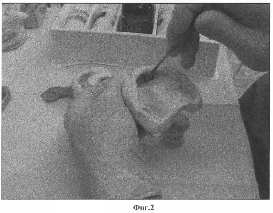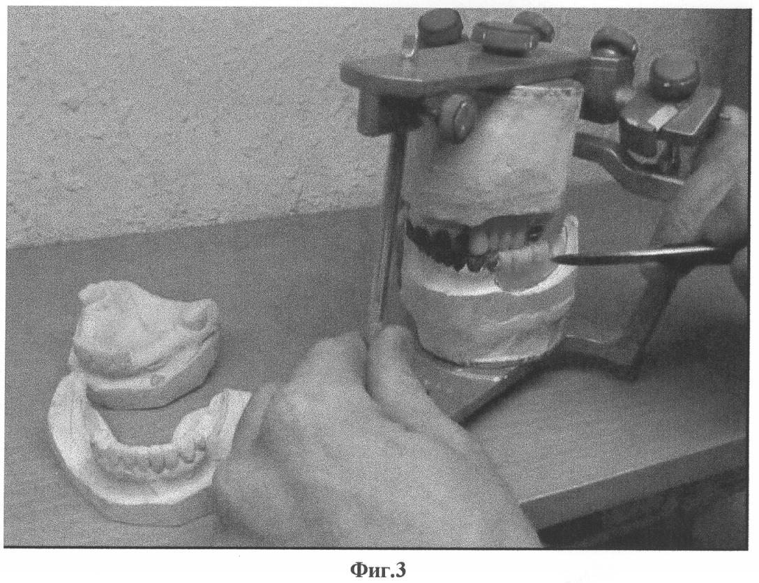 В клинике проводят препарирование опорных зубов пациента под несъемный временный протез и с ранее подготовленной диагностической модели снимают оттиск. Заполняют оттиск пластмассой холодной полимеризации (фиг.2) и накладывают его на зубной ряд. Таким образом, полученный временный несъемный протез обрабатывают и фиксируют на временный цемент. В это же посещение накладывают временный съемный протез (фиг.4).