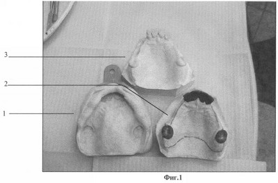 Для изготовления временных частично съемных пластиночных протезов проводят дублирование модели (фиг.1). Изготавливают непосредственный съемный протез на продублированной модели по одной из известных методик (фиг.3).