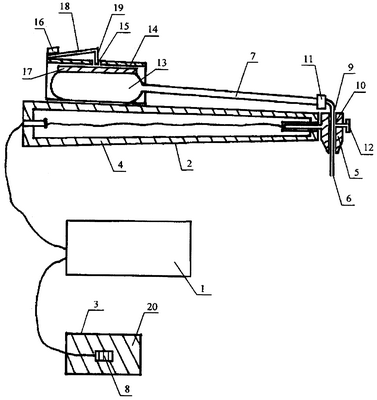 Рабочий конец капилляра 6 подносят к исследуемому участку зуба, нажимают на дозатор 18. Своим выступом 19 дозатор нажимает на защитный кожух 17 и на эластичный баллон 13. Микрокапля раствора электролита выходит из рабочего конца капилляра 6 и наносится на исследуемый участок зуба. Производят измерение. Измерительный блок состоит из чувствительного гальванометра с ценой деления 0,11×10-6 А, двух постоянных и одного переменного сопротивления и источника тока. Источником тока служит батарея 3336 л, ЭДС 4,5 В, позволяющая с помощью переменного омического сопротивления получать на электродах постоянное напряжение 3 В. В зависимости от выбранного дозатора получают нужную величину капли электролита.