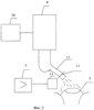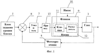 Устройство работает следующим образом: при высыхании глаза интенсивность света от источника 2, отраженного им, снижается. Следовательно, уменьшается и поток света, попадающий на фотоприемник блескомера 4, что регистрируется сравнивающим устройством 6, сопоставляющим сигнал с блескомера с необходимым значением, сформированным в блоке задания уровня блеска 5. Со сравнивающего устройства сигнал рассогласования поступает через усилитель 7 на привод 13 открывания клапана 11. Клапан 11 при открывании пропускает из флакона 9 жидкость, вытекающую под давлением насоса 10, которая поступает в насадку, и из-за малости отверстия последняя распыляет физический раствор, увлажняя глаз.