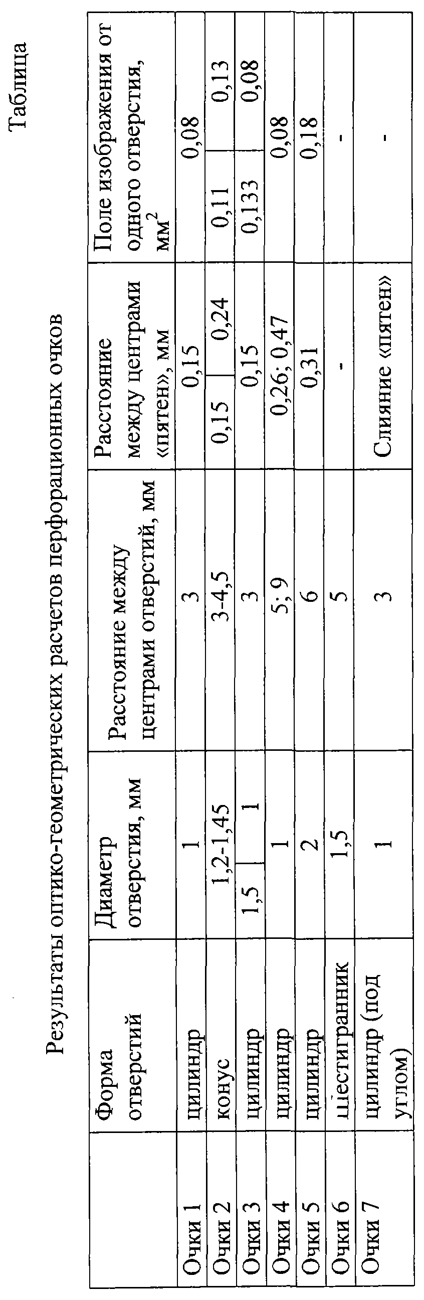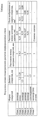 Как видно из таблицы 1, слишком большие цилиндрические отверстия, в том числе переходящие в конус, сливаются в общее световое пятно на сетчатке глаза. Отверстия, расположенные на выпуклой (от глаза) пластине, в зависимости от радиуса кривизны собирают световые потоки от отверстий в пучок на роговице глаза, сетчатке до или за сетчаткой и в любом случае создают общее световое пятно. Отверстия не круглые, например треугольные, четырехугольные и т.п., приводят к нарушению сферичности дифракционной картины и не создают концентрических цветовых или тень-свет колец, что неестественно для сферического бинокулярного зрения.