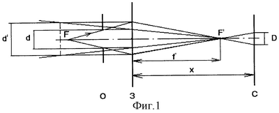 Изображение удаленной точки формируется не в фокальной плоскости, а в плоскостях, расположенных вне фокуса на расстоянии х от него, наблюдается большое световое пятно фиг.3.