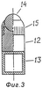 На фиг.3 представлен вариант исполнения массажного элемента, который состоит из цилиндрического корпуса 12, укрепленного на рабочей трубке 13. На верхнем конце корпуса сделано углубление со сферической поверхностью и в нем с возможностью свободного вращения помещен шарик 14, который фиксирован с помощью накидной гайки 15, навинченной на корпус 12. При таком выполнении массажного элемента облегчается скольжение массажера по массажируемой поверхности тела.
