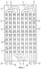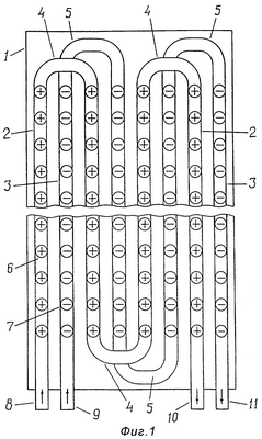 Массажер состоит из прямоугольной панели (плиты) 1 (фиг.1, 2), на верхней поверхности которой укреплены два трубопровода раздельно для горячей и холодной воды. Каждый трубопровод состоит из ряда параллельных рабочих трубок 2 и 3, причем трубки «горячего» (2) и «холодного» (3) трубопроводов расположены в порядке чередования в одной плоскости. Смежные концы рабочих трубок в каждом трубопроводе последовательно соединены друг с другом с помощью трубчатых перемычек 4 и 5, в качестве которых также могут быть использованы широко применяющиеся в гидравлических системах гибкие шланги с накидными гайками на концах. На рабочих трубках на заданном расстоянии друг от друга расположены средства для реализации термоконтрастного воздействия, выполненные в виде одинаковых или же различающихся, в частности, по высоте массажных элементов (выступов) 6 и 7 цилиндрической, конусовидной или иной формы со скругленными рабочими концами. «Холодные» массажные элементы 7 на чертежах условно обозначены знаком «-», а «горячие» (6) – знаком «+». Трубопроводы на одном конце имеют входные патрубки 8 для горячей и холодной (9) воды, а на другом конце – соответствующие им выпускные патрубки 10 и 11. Все четыре патрубка снабжены кранами (не показаны). Для изготовления массажера могут быть использованы как круглые, так и прямоугольные (квадратные) в сечении трубы. Массажер может иметь как прямоугольную, так и иную, например круглую форму.