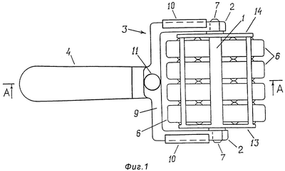 Массажер содержит легко и быстро снимаемый цилиндрический массажный валик 1 (фиг.1, 3, 4), с возможностью вращения вокруг оси установленный между параллельными боковинами 2 скобы 3, и укрепленную на скобе ручку 4. На валике сделан ряд открытых с одного конца продольных параллельных пазов 5 и в каждом из них в ряд, в порядке чередования и с возможностью вращения вокруг оси установлены частично выступающие над поверхностью валика 1 съемные “холодные” и “горячие” цилиндрические массажные элементы 6. Оси массажных элементов ориентированы параллельно оси массажного валика 1. При этом как в продольных, так и в циркулярных рядах в каждой паре смежных массажных элементов один является “холодным”, а другой – “горячим”, т.е. разнотемпературные массажные элементы на поверхности массажного валика рассредоточены в шахматном порядке. Ширина паза 5 на выходе (у цилиндрической поверхности валика) несколько меньше диаметра массажных элементов 6, благодаря чему последние не выпадают из паза. На торцах массажного валика 1 имеются две соосные цапфы 7, которые установлены в пазах 8 (фиг.3), сделанных на концах боковин 2. Выходы из пазов перекрываются щеколдой 9, наложенной на скобу 3 и в основных своих чертах повторяющей ее форму. Направленные перемещения щеколды обеспечиваются за счет ее размещения в параллельных пазах, сделанных в бортиках 10 вдоль наружных краев боковин 2. Фиксация щеколды производится с помощью винта 11, ввинчиваемого в резьбовое отверстие 12 у основания ручки 4. Осевые перемещения массажных элементов ограничены с одной стороны торцовой стенкой 13 массажного валика 1, а с другой – диском 14, в котором имеется центральное отверстие и он надет на цапфу с возможностью снятия.