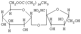Жирнокислотные сложные эфиры сахарозы являются неионными поверхностно-активными веществами, состоящими из сахарозы в качестве гидрофильной части и одного или нескольких остатков жирных кислот в качестве липофильных групп. Они получаются из очищенного сахара и растительных масел. Так как сахароза содержит в целом 8 гидроксильных групп, то можно получить производные, составляющие диапазон от моно- до октаэфиров сахарозы с жирными кислотами. Следующая формула демонстрирует в качестве примера химическую структуру моностеарата сахарозы