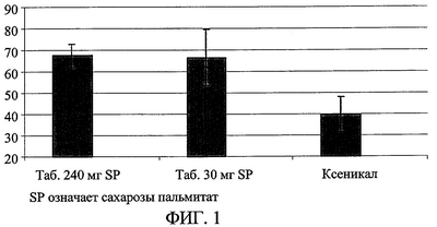 Фиг.1 показывает, что композиции, основанные на сложных эфирах сахарозы, проявляют примерно в 1,7 раза более высокую эффективность с 240 мг сложного эфира сахарозы Р1670, составляющую 67,4 (±5,3%, n=5), с 30 мг сложного эфира сахарозы Р1670, составляющую 66,6% (±13%, n=4), по сравнению с ксеникалом, эффективность которого составляет 39,7% (±8,1%, n=5), в эксперименте двойного приема пищи, проведенном на добровольцах.