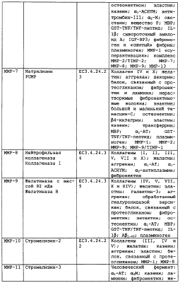 46. Раствор по п.41, в котором ингибитор катаболизма хряща выбран из группы, состоящей из ингибиторов матричных металлопротеиназ, которые ингибируют катаболизм хряща, молекул клеточной адгезии, включая агонисты интегринов и антагонисты интегринов, которые ингибируют катаболизм хряща, антихемотаксических агентов, которые ингибируют катаболизм хряща, ингибиторов внутриклеточной передачи сигналов, включая ингибиторы протеинкиназы С и ингибиторы тирозиновых протеинкиназ, которые ингибируют катаболизм хряща, модуляторов внутриклеточных (белок-тирозин)-фосфатаз, которые ингибируют катаболизм хряща, и ингибиторов SН2-доменов, которые ингибируют катаболизм хряща.