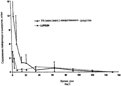 Сополимер (DL-лактид-гликолид) с отношением количества лактида к количеству гликолида 50/50 и с концевой карбоксильной группой (RG 504H от компании Boehringer Ingelheim) растворяли в N-метил-2-пирролидоне (NMP) с получением 34% (масс.) раствора полимера. Данным раствором полимера ATRIGEL® заполняли полипропиленовые шприцы объемом 1,25 куб. см с фитингом в виде охватывающего люэровского наконечника до объема 330 мл и проводили терминальную стерилизацию под действием гамма-излучения до достижения дозы 20 килогрэй. Молекулярная масса полимера после гамма-облучения составляла 32000 дальтон. Ацетат лейпролида растворяли в воде, стерилизовали фильтрованием, пропуская через фильтр 0,2 мм, и препаратом заполняли полипропиленовый шприц объемом 1,00 куб. см с фитингом в виде охватываемого люэровского наконечника. Водный раствор замораживали и воду удаляли в вакууме до получения 10,2 мг лиофилизованной лепешки пептида. Два шприца соединяли непосредственно перед использованием и содержимое смешивали, перегоняя его туда и обратно между двумя шприцами в ходе 30 циклов. Композицию отбирали обратно в шприц с охватываемым соединительным элементом, два шприца разъединяли и присоединяли иглу размера 20 длиной полдюйма. Затем содержимое шприца подкожно инъецировали 7 кобелям породы коротконогая гончая до получения в совокупности количества 250 мг полимерной композиции, содержащей 7,5 мг ацетата лейпролида. Второй группе из 7 собак породы коротконогая гончая внутримышечно инъецировали микросферы Lupron® Depot, содержащие 7,5 мг ацетата лейпролида. Образцы сыворотки отбирали у всех собак на базовой линии и в дни 1, 3, 7, 14, 21, 28, 35, 42, 49, 55, 63, 77 и 91.