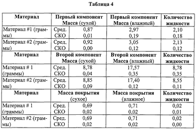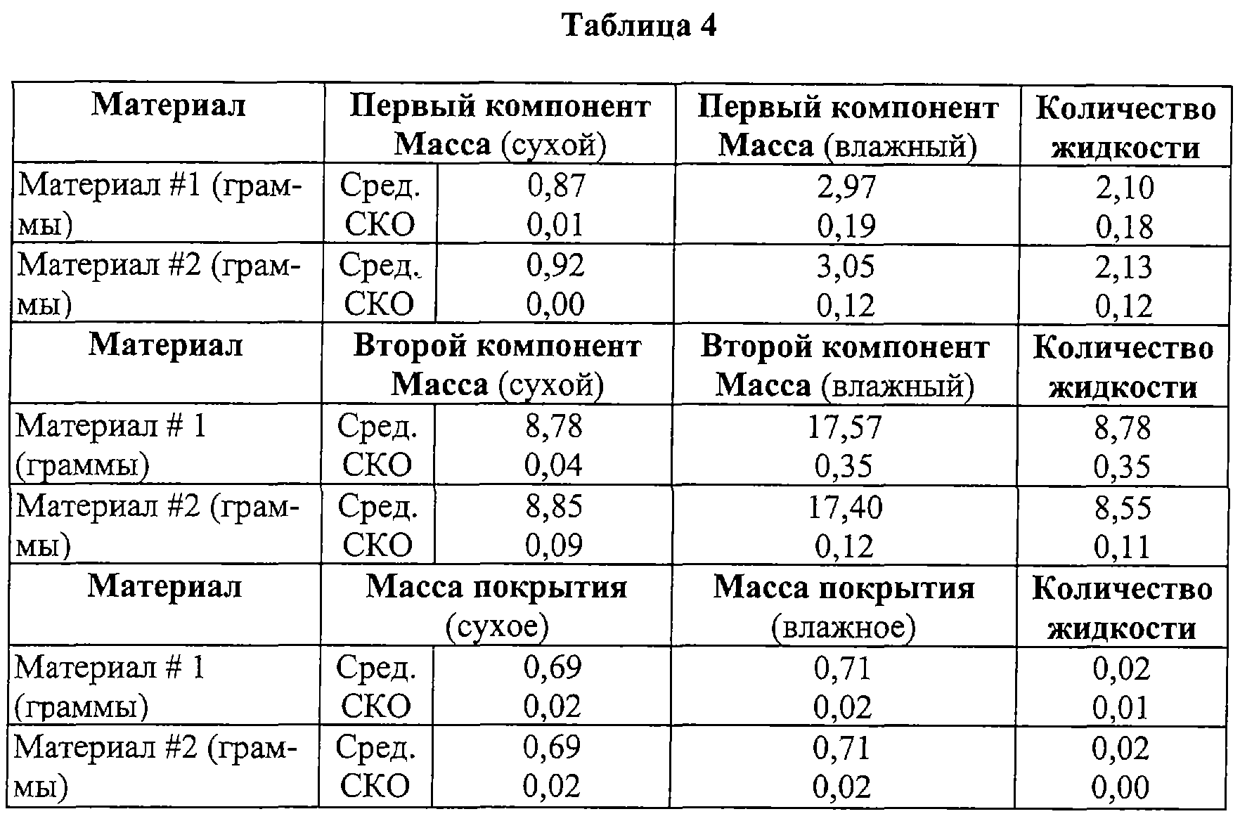 Другой материал, использованный для первого абсорбирующего жидкость компонента, имеет массу единицы площади, приблизительно, 200 г/м2. Этот материал указан в Таблицах 4 и 5 как «материал #2» и включает первый слой, полученный аэродинамическим способом, имеющий массу единицы площади, приблизительно, 50 г/м2. Первый слой содержал приблизительно, 85 масс.% сложного полиэфирного волокна – 15 денье на нить, соединенную вместе с, приблизительно, 15 масс.% обычного связующего латекса, пригодного для предметов личной гигиены. Материал #2 включал второй слой, полученный аэродинамическим способом, имеющий массу единицы площади, приблизительно, 150 г/м2. Этот второй слой содержал, приблизительно, 90 масс.% распушенной целлюлозы и, приблизительно, 10 масс.% бикомпонентного связующего волокна, состоящего из ядра из сложного полиэфира и оболочки из полиэтилена или подобного полиэтилену материала, который размягчается или плавится, когда нагревают сухое латексное связующее и термически активируют связующие волокна. Это специфическое сочетание слоев имело площадь 38 квадратных сантиметров и толщину, приблизительно, 1,6 миллиметров (0,16 см), давая расчетный объем, приблизительно, 6,1 см3.