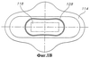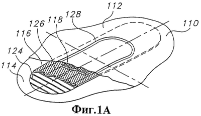 Фигуры 1а, 1б и 1в показывают вид с частичным разрезом, вид в поперечном разрезе и вид сверху, соответственно, для образца женской прокладки в соответствии с первым вариантом осуществления настоящего изобретения.