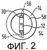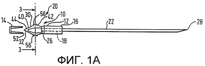 Как показано на фиг.1А-1С, возможно прямолинейное перемещение соединителя 14 навстречу фиксатору 12 до тех пор, пока внутренний край 58 заплечика 54 не войдет в зацепление с ножками 30, как показано на фиг.1В. Дальнейшее прямолинейное перемещение соединителя 14 вдоль оси иглы 22 вызывает поперечное перемещение ножек 30 навстречу друг другу. В конце концов заплечик 54 заходит за выступы 56, снабженные скошенными поверхностями 58, благодаря которым обеспечена возможность захода заплечика 54 за выступы 56. Напротив скошенных поверхностей 58 расположены плоские поперечные поверхности 60, предотвращающие отсоединение соединителя 14 от фиксатора 12 после того, как заплечик 54 зашел за выступы 56. Таким образом, соединитель 14 и фиксатор 12 находятся во взаимном зацеплении, как показано на фиг.1C.