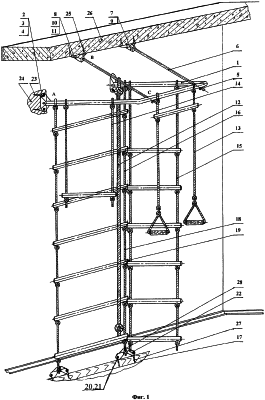 Спортивный комплекс состоит из П-образной скобы 1 с двумя кронштейнами 2, которые скреплены с П-образной скобой 1 болтами 3 и гайками 4. С П-образной скобой 1 гайками 5 соединяется тяга 6 с двумя ушками 7 и двумя кронштейнами 8, причем тяга 6 соединяется с ушком 7 гайками 9, а ушко 7 соединено с кронштейном 8 болтами 10 и гайками 11. На П-образной скобе 1 подвижно закреплены гимнастические элементы: канат для лазания 12, кольца гимнастические 13, перекладина 14, лестница веревочная 15, а также шведская стенка 16, которая выполнена в виде натянутых и закрепленных между П-образной скобой 1 и полом 17, двух гибких связей 18 с установленными на них с равным шагом горизонтальными перекладинами 19, и болтами 20 и гайками 21 соединена с кронштейнами 22.