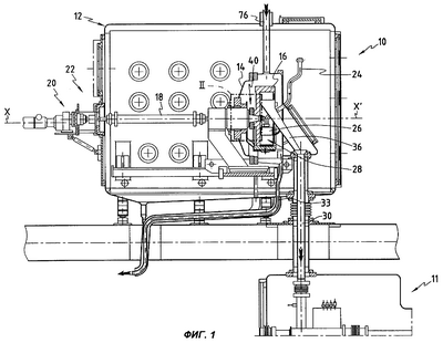 Снаружи от вертикальной стенки 16а вокруг приводного вала 18 размещена соединительная система 40, образованная первым диском 44, который называется также зеркалом и установлен с возможностью вращения, и вторым неподвижным диском 46, который называется также контр-зеркалом.