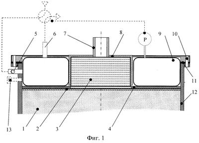 Различные способы создания давления в эластичной камере 9 (от внешнего источника питания, от компрессора, питающего адсорбер, с регулируемым клапаном избыточного давления) независимо от давления в адсорбере позволяют создать необходимое усилие поджатие, которое является достаточным для исключения флюидизации слоя сорбента, с одной стороны, и компенсировать объемное расширение и сжатие сорбента при его работе.
