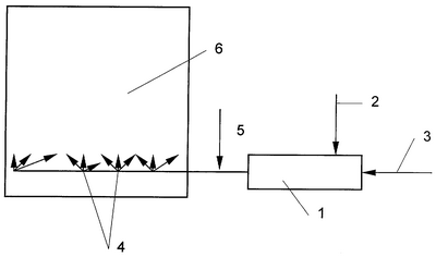 В высокоскоростной реактор 1 по линии 2 подают водный раствор карбамида с концентрацией 20-40 мас.%, по линии 3 подают перегретый пар с температурой 200-400°С. Расход раствора карбамида определяется объемом очищаемых газов и концентрацией в них оксидов азота. Расход перегретого пара зависит от расхода раствора карбамида и может составлять 15-30 кг на 1 кг раствора. В высокоскоростном реакторе под давлением 3-10 атм происходит контакт водного раствора мочевины и перегретого пара в течение 0,5-5,0 с, в результате которого протекает термическое разложение карбамида и испарение продуктов разложения с образованием парогазовой восстановительной смеси, которую через сопловые устройства 4, подключенные к выходу высокоскоростного реактора, с помощью линии подачи 5 газа-носителя вводят в газоход 6, температура газового потока в котором находится на уровне 700-1200°С.