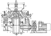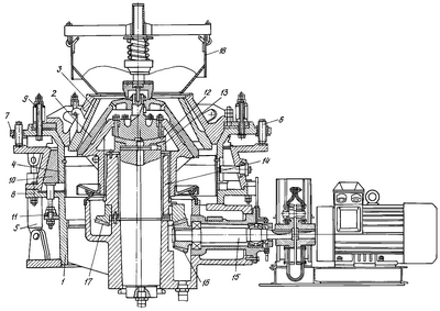Дробилка также имеет сферическую опору 12 подвижного дробящего конуса 2, опирающуюся на постель 13, эксцентриковый вал 14, приводной вал 15, шестерни 16, 17 и бункер 18.