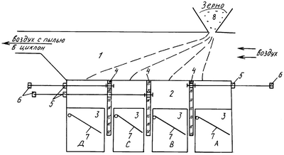 Работа сепаратора осуществляется следующим образом. Из бункера 8 зерно подается в радзувочную камеру, где воздушный поток заслонками регулируется таким образом, чтобы различные его фракции разделялись по всей длине делительной камеры и через клапаны выходили: в канал А – камни и немагнитные металлопримеси; в канал В – помольное зерно; в канал С – фуражное зерно; в канал Д – соломистые примеси. Пыль уходит вместе с воздухом в циклон. Перемещение винтами 6 заслонок 4 дает возможность менять длину каждой зоны улавливаемого продукта, т.е. его количество.