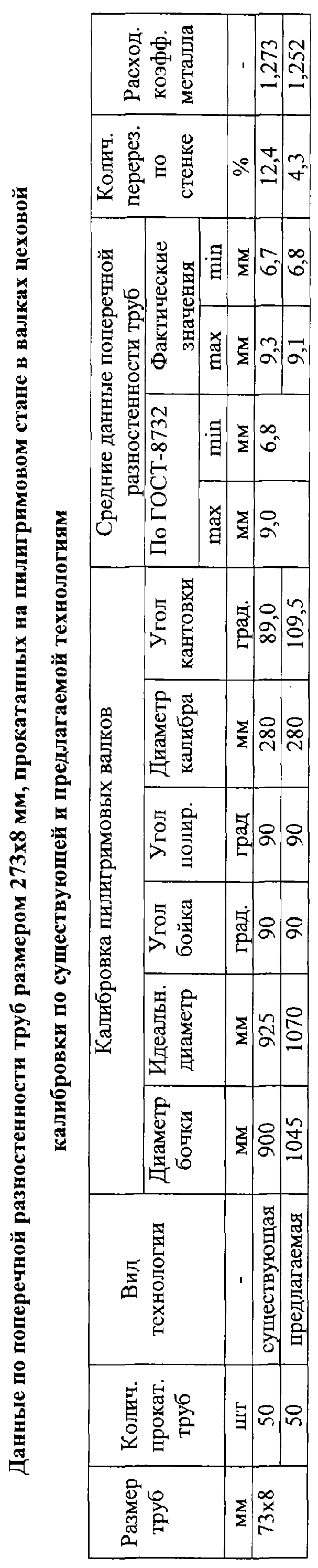 Проведены сравнительные прокатки труб размером 273×8 мм из слитков диаметром 13″ (500/470×1700 мм) стали марки 20 (100 слитков). Слитки в прошивном стане прошивались в гильзы размером 460×290вн.×3000 мм. Пятьдесят гильз прокатывались на пилигримовом стане в валках с диаметром бочки 900 мм (существующая технология). Угол кантовки гильз-труб при использовании дрели с шагом 4800 мм по существующей технологии составлял 90° (расчетный угол кантовки 89°). Вторая половина гильз (50 шт.) прокатывались на пилигримовом стане в валках с диаметром бочки 1045 мм (предлагаемая технология). Угол кантовки гильз-труб при использовании дрели с шагом 4800 мм по предлагаемой технологии составлял 110° (расчетный угол кантовки 109,5°). Трубы прокатывались длиной 36-37 метров и разрезались на три части длиной 12-12,5 метра. После прокатки все трубы (300 шт.) подвергались контрольным замерам стенки с каждого конца с фиксированием максимального и минимального значений. Среднее значение максимальных толщин стенок на трубах, прокатанных по существующей технологии, составило 9,3 мм, а на трубах, прокатанных по предлагаемой технологии, – 9,1 мм. Среднее значение минимальных толщин стенок на трубах, прокатанных по существующей технологии, составило 6,7 мм, а на трубах, прокатанных по предлагаемой технологии, – 6,8 мм (по ГОСТ 8732 толщина стенки, соответственно, 9,0 и 6,8 мм). Количество перерезов по стенке на трубах, прокатанных по существующей технологии, составило 12,4%, из них по превышению плюсового поля допуска 9,3%, а минусового 3,1%. Количество перерезов по стенке на трубах, прокатанных по предлагаемой технологии, составило 4,3%, из них по превышению плюсового поля допуска 3,1%, а минусового 1,2%. Расходный коэффициент металла (основной экономический показатель) на трубах, прокатанных по существующей технологии, составил 1,273, а на трубах, прокатанных по предлагаемой технологии, 1,252, т.е. экономия металла на 1 тонне труб составила 21 кг.