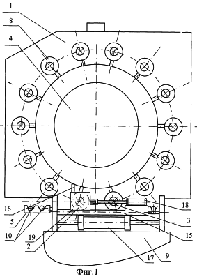 Технологические заглушки 11 находятся в кассете 16 механизма 15. Механизм 15 приводом 17 приводится в крайнее положение, определяемое упором таким образом, чтобы первая технологическая заглушка, находящаяся в отверстии корпуса 19 механизма 15, расположилась напротив позиции загрузки 2 оболочки тепловыделяющего элемента 10 в барабан 4. Уплотнение 12 заглушки 11 в исходном состоянии сжато. Штоком привода 18 пружина, находящаяся под корпусом 22 заглушки, при помощи коромысла, расположенного в корпусе 19 механизма 15, дополнительно сжимается, освобождая уплотнение 12 заглушки 11, при этом уплотнение 12 приходит в свободное состояние, при котором его диаметр меньше диаметра заходной части 13 заглушки 11. Оболочки тепловыделяющих элементов 10, заранее собранные с привариваемыми заглушками, находятся в ложементах транспортера 5 и пошагово перемещаются в горизонтальной плоскости. Перемещение осуществляется до тех пор, пока первая оболочка не попадет на позицию загрузки 2. Включается механизм 6 загрузки и выгрузки оболочки, оболочка устанавливается в барабан 4 и реверсивным приводом 7 подается свободным концом в отверстие корпуса 19 механизма 15, в котором находится технологическая заглушка 11 с уже разжатым уплотнением 12. Так как диаметр заходной части 13 технологической заглушки 11 меньше внутреннего диаметра оболочки тепловыделяющего элемента 10, а диаметр разжатого уплотнения 12 меньше диаметра заходной части 13, то оболочка в процессе осевого перемещения свободно наезжает на заглушку и занимает крайнее положение, не повреждая уплотнение 12 и не касаясь его торцом. Наличие этого положения фиксируется датчиком, который расположен на позиции 2 загрузки транспортера 5 со стороны свариваемого конца оболочки. После этого шток привода 17 уходит в другое крайнее положение, при этом технологическая заглушка 11 становится свободной от фиксации. Уплотнение 12 сжимается за счет подвижного относительно центральной части 21 технологической заглушки 11 подпружиненного корпуса 22, герметизируя внутренний объем оболочки со стороны открытого торца оболочки по ее внутренней поверхности. Включается реверсивный привод 7 механизма 6 загрузки и выгрузки, который подает оболочку тепловыделяющего элемента 10 с установленной на ее свободном конце технологической заглушкой 11 в осевом направлении в первую загрузочную вакуумную камеру установки. Герметизация камеры осуществляется через вакуумный ввод 8 во время кругового перемещения барабана 4. Из кассеты 16 механизма 6 следующая технологическая заглушка 11 попадает в отверстие корпуса 19, и цикл установки технологических заглушек повторяется по мере подачи транспортером 5 новых оболочек. Так повторяется до тех пор, пока первая оболочка, пройдя все вакуумные камеры, в том числе и камеру, где осуществляется сварка, не попадает на позицию 3 выгрузки. Перед выгрузкой во время сварки очередной оболочки механизм 15 устанавливается напротив этой позиции. Механизмом 6 оболочка с приваренной заглушкой выводится из рабочей камеры, а конец ее с технологической заглушкой 11 входит в отверстие корпуса 19 механизма 15, где освобождается от нее в обратной последовательности. Далее механизмом 6 конец оболочки выводится из корпуса 19, и оболочка сгружается на транспортер 5. Положение концов оболочки тепловыделяющего элемента 10 и технологич