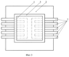 На фиг.3 изображена металлическая пластинка в виде гребенки вместе со стеклянной и керамической пластинами, вид на кремниевую пластину (один из вариантов).