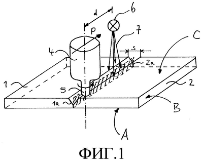 На фиг.1 схематично представлено устройство для лазерной сварки трением с перемешиванием. Соединяемые между собой детали 1 и 2 прижимаются друг к другу вдоль боковых поверхностей 1a и соответственно 2а. Прижатые друг к другу детали 1 и 2 закрепляются в таком положении и удерживаются при помощи не показанного на фиг.1 фиксирующего приспособления. В зону соединения между прижатыми друг к другу боковыми поверхностями 1а и 2а в материал деталей вводится вращающийся зонд 5, проникающий в материал деталей с обеих сторон зоны соединения. Зонд 5 установлен на конце инструмента для FS-сварки 4 и выполнен из более твердого материала, чем деталь. Инструмент для FS-сварки 4 с зондом 5 работает от не показанного на фиг.1 двигателя.