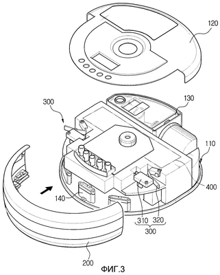 Бампер 200 соединен с корпусом 110 пылесоса с целью смягчения удара, обусловленного внезапным столкновением с неожиданным препятствием, и поэтому предотвращает повреждения корпуса 110 пылесоса. Бампер 200 предназначен для того, чтобы закрывать переднюю поверхность и частичную боковую поверхность корпуса 110 пылесоса. Например, если корпус 110 пылесоса имеет круглую форму, то бампер 200 имеет, по существу, форму полукольца. Хотя предпочтительно изготавливать бампер 200 из пластика, стойкого к ударам, это не следует считать ограничительным признаком изобретения.