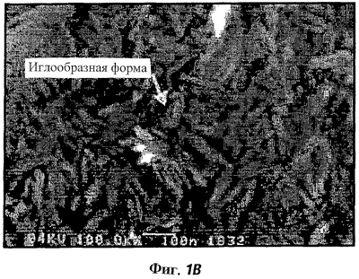 На фиг.1А и 1В показаны известные тонко диспергированные частицы бемита (фиг.1А) и иглообразные частицы бемита в соответствии с настоящим изобретением (фиг.1В).