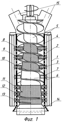 Растительная масса поступает в загрузочные бункеры 15, где она подхватывается витками 4 и подвергается первоначальному сжатию, при этом из нее удаляется воздух. Затем отжимаемая масса транспортируется в зону 5. Здесь происходит значительное увеличение порового давления жидкости в клетках растительного сырья. Дальнейший отжим сопровождается фильтрацией жидкости через перфорации вала 3, сита 2 и фильтрующие контрлопасти 8-10. На следующем этапе в зоне 6 происходит повторное сжатие сырья, увеличение в нем порового давления жидкости, без ее фильтрации. Затем сырье попадает в нижнюю часть пресса, где из него окончательно удаляется жидкость через перфорации вала 3, сита 2 и фильтрующие контрлопасти 11-13. Схемы расположения контрлопастей 7 и фильтрующих контрлопастей 8-13 гарантируют предотвращение перемешивания, радиального перемещения материала в рабочей камере пресса и рыхлят его. Оптимальное давление прессования на выходе из пресса создается регулировочным конусом 14.