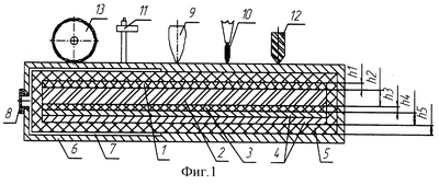 Толщина h1 слоя из термостойкого материала выбирается из условия обеспечения затяжного плавного разогрева высокотвердого слоя из неметаллического материала для исключения образования в нем трещин при термическом ударе.