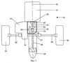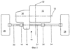 Коробка 14 передач установлена позади двигателя 12, а входной приводной вал 54 коробки передач проходит перпендикулярно оси коленчатого вала двигателя. На приводном валу 42 установлено первое коническое зубчатое колесо 50 между гибкой муфтой 40 и разъединительным устройством 44, а на входном приводном валу 54 установлено второе коническое зубчатое колесо 52, вводимое в зацепление с первым коническим зубчатым колесом 50. Поэтому движение от двигателя 12 передается под углом 90° посредством конических зубчатых колес 50, 52 в коробку 14 передач. Приводной вал 42, конические зубчатые колеса 50, 52, разъединительное устройство 44 и гибкая муфта 50 все вместе заключены в картере 53.