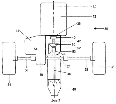 Дифференциал 16, выполненный как единое целое с коробкой 14 передач, обеспечивает приведение в движение задних колес 34, 36 транспортного средства с помощью полуосей 56, 58. Полуось 56 приводится в движение непосредственно от левой (в соответствии с чертежом) стороны дифференциала 16. Полуось 58 приводится в движение непосредственно от правой (в соответствии с чертежом) стороны дифференциала 16 через передаточный вал 21. Способом, известным в данной области техники, в полуоси можно встроить карданные шарниры постоянных угловых скоростей или другие универсальные шарниры.