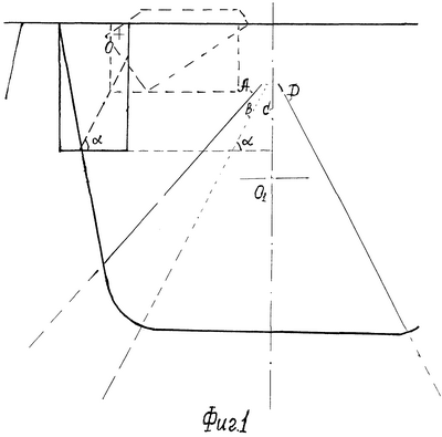 На фиг.1 изображена простилающаяся впереди водителя проезжая часть дороги с однорядным двусторонним движением, где линия А – левый от водителя край проезжей части; В – разделительная осевая линия встречной полосы движения; С – ось курса движения автомашины, уровня правого глаза водителя; D – правый край дороги от водителя; O1 – точка, центр взгляда водителя, оптическая ось; проезжая часть изображена на фоне очковой оправы. Разделительная полоса, ось дороги видится водителю под углом к горизонту. Верхняя левая четверть сектора обзора глаза, ограниченная пунктирной горизонтальной линией и осевой СО1 – положение светофильтра известных способов защиты водителя от ослепления в исходном положении, при отсутствии источника ослепления. В верхнем поле зрения изображен светозащитный экран с осью вращения О, с расположением ее в верхнем углу экрана, с вертикальной границей справа и горизонтальной границей в нижней части – показано сплошной линией. Пунктирной линией показан тот же светозащитный экран с частью границ с наклоном под углом , для примера, при работе в ночное время. Штриховой линией малым контуром показано при работе в дневное время с горизонтальным расположением ночных рабочих границ светозащитных экранов, повернутых на оси вращения О.