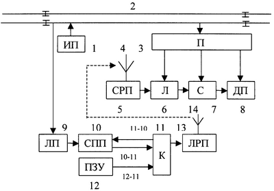 Работа локомотивных устройств происходит следующим образом. На станции формирования поезда машинист вводит в ПЗУ 12 информацию о длине поезда. При выходе локомотива с РЦ 2 локомотивный приемник 9 (соответствует системе АЛСН: приемные катушки, фильтр, локомотивный приемник с импульсным реле) прекращает прием сигнала с РЦ 2 (от источника питания 1) и включается счетчик пройденного пути (осевой датчик пути и счетчик). Выход СПП 10 (связь 10-11) воздействует на компаратор 11. На второй вход компаратора 11 (связь 12-11) воздействует ПЗУ 12, в котором записана информация о длине поезда на станции формирования. При совпадении входных сигналов компаратор воздействует на СПП 10, обнуляя его, и на ЛРП 13, который посредством локомотивной антенны 14 передает радиоимпульс на стационарный приемник 5 через антенну 4.