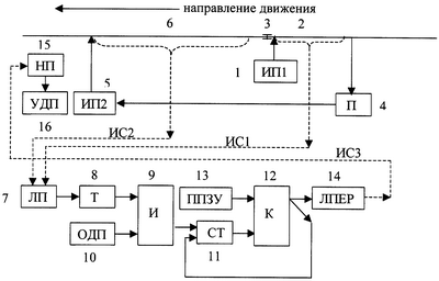 Схема содержит напольные и локомотивные устройства. Сначала в работе устройства участвуют следующие напольные устройства: источник питания (ИП1) 1, рельсовая цепь (РЦ1) 2, изолирующий стык на выходе первой РЦ 3, путевое реле (П) 4, второй источник питания (ИП2) 5 для второй рельсовой цепи (РЦ2), вторая рельсовая цепь (РЦ2) 6. Затем начинается действие локомотивных устройств: локомотивного приемника (ЛП) 7, триггера (Т) 8, логического элемента (И) 9, осевого датчика пути (ОДП) 10, счетчика (СТ) 11, компаратора (К) 12 и локомотивного передатчика (ЛПЕР) 14. Далее снова действуют напольные устройства: напольный приемник (НП) 15 и узел дачи прибытия (УДП) 16.