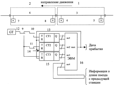 Схема устройства содержит первую рельсовую цепь (РЦ) 1 и РЦ 2, первая РЦ 1 содержит рельсовую линию (РЛ) 3, источник питания 4 и приемник (путевое реле) 5, вторая РЦ 2 содержит рельсовую линию (РЛ) 6, источник питания 7 и приемник (путевое реле) 8. Контакты путевых реле 9, 10 и 11 соединяют выход тактового генератора 12 с тактовыми входами первого 13, второго 14 и третьего 15 счетчиков. Выходы каждого из счетчиков соединены с входами ЭВМ 16. Еще к одному входу ЭВМ 16 подсоединена шина, по которой передают информацию со станции отправления о длине поезда. С выхода ЭВМ на станцию отправления поступает сигнал дачи прибытия, который формируется только при условии, что фактическая длина прибывшего поезда совпадает с длиной отправленного. При этом происходит обнуление счетчиков, входы обнуления которых соединены с выходом ЭВМ.
