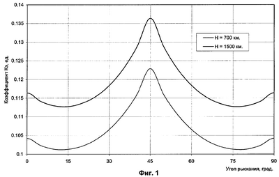 Данный положительный эффект можно усилить, если исполнить КА в поперечном сечении в виде ромба с величиной острого угла в диапазоне 50-90°. Наибольший эффект достигается при такой ориентации КА, когда меньшая диагональ ромба находится в плоскости орбиты, а следовательно, его большая диагональ перпендикулярна плоскости орбиты. Данное утверждение иллюстрируется приведенной на фиг.2 зависимостью коэффициента Кэ от угла рыскания при остром угле ромба, равном 60°, для высот орбит, равных 700 км и 1500 км. Нулевому значению угла рыскания соответствует положению КА, когда в плоскости орбиты находится меньшая диагональ ромба.