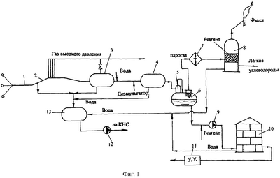 Сероводород и меркаптаны содержащую продукцию нефтяных скважин направляют в успокоительный коллектор 1, в котором происходит снижение скорости движения этой продукции и далее в депульсатор 2, где осуществляют предварительный отбор газа. Кроме того, в этом же депульсаторе осуществляют сброс воды. Нефть с остаточным газом, находящимся в свободном состоянии и распределенном в объеме жидкости, вводят в сепаратор первой ступени 3. Газ из сепаратора 3 объединяют с газовым потоком из депульсатора 2 и направляют на установку подготовки газа. В сепараторе 3 также осуществляют сброс остаточной воды в буферную емкость 13, из которой насосом 12 откачивают на кустовую насосную станцию (КНС) для закачки в пласты. Перед вводом продукции скважин в сепаратор 4, как правило, добавляют деэмульгатор и пресную воду. Промытую и подготовленную продукцию скважин направляют в процессор-гидроциклон специальной конструкции, обеспечивающий процесс гидроциклонирования продукции. Процессор может быть снабжен одним или несколькими гидроциклонными элементами. Отличительной особенностью гидроциклона специальной конструкции является то, что в нем обеспечивается предварительный нагрев продукции скважин за счет снабжения гидроциклонного элемента нагревательным устройством, например НГЛ-160, осуществляющим нагрев с помощью электрического тока. Кроме того, гидроциклонный элемент выполнен так, что на расстоянии 1/3 от основания конической части угол конусности уменьшается на 30%. По сравнению с традиционными гидроциклонными элементами это изменение конструкции позволило интенсифицировать процесс гидроциклонирования. В гидроциклоне, как уже отмечалось, за счет интенсивной крутки потока в центре вращения образуется разрежение, куда устремляются парогазовая смесь. Параметром определения интенсификации осуществления процесса гидроциклонирования является величина этого разрежения (см.[3]). Применение усовершенствованной конструкции гидроцикла увеличивает величину разрежения приблизительно на 15-20% и обеспечивает создание устойчивого парогазового шнура в центре вращения потока.