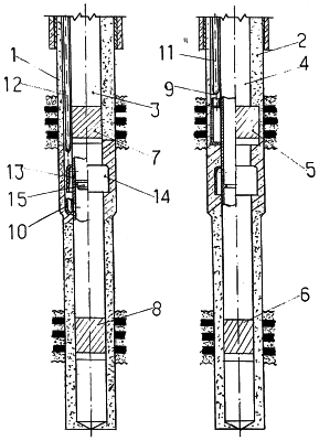 Верхняя часть вспомогательной скважины 1 выполнена добывающей и снабжена фильтровой колонной 7, а нижняя вспомогательная часть оборудована фильтровой колонной 8. Фильтровые колонны 5, 8 соединены с откачивающими или нагнетательными колоннами 9, 10, которые снабжены дополнительными нагнетательными трубами 11, 12. Фильтровые колонны 6, 8 снабжены цементировочными муфтами 13, выполненными с радиальными каналами и перекрывающей трубой 14.
